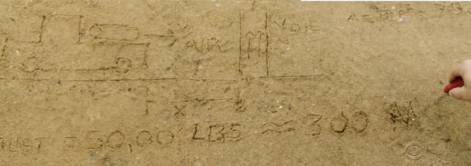 You might have missed it, but MacGyver needs to calculate how close the truck with jet engine needs to get to the fire in order to put it out. Here is his work (he wrote it in the sand).