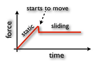 The key concept here is friction. Friction is actually uber-complicated, but a simple model works for many cases. Static friction is a force exerted on an object when it is in contact with some surface but those two surfaces do not move relative to each other. Kinetic friction is a force exerted on an object when the two surfaces are moving. Suppose I have a block at rest on a table and I pull it with a slowly increasing force. This is what it would look like: