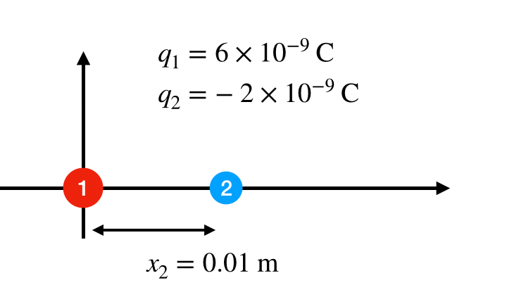 Suppose I have two charges that are both located on the x-axis. Charge 1 is at the origin with a charge of 6 nC. Charge 2 is at x = 0.02 meters with a charge of -2 nC. Here’s a diagram—just for fun.